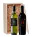 Een 2-fles wijnkist met daarineen fles Nr. 21 Cuvée Unique en een fles Nr. 44 Merlot-Cabernet van T..