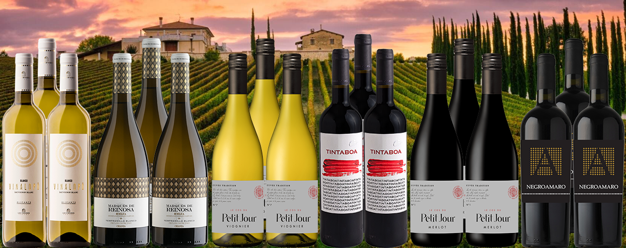 Het Favorieten Pakket 2025 bestaat uit 9 flessen witte wijn en 9 flessen rode wijn uit Spanje, Frankrijk en Italië: